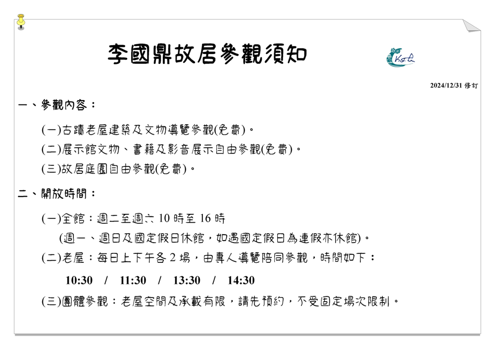 老屋:每日上下午各2場,由專人導覽陪同參觀,時間如下:10:30 / 11:30 / 13:30 / 14:30