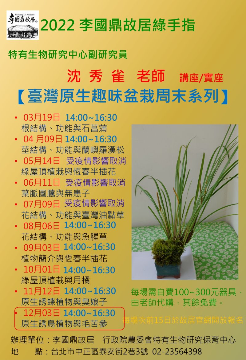 - 每場次需自付代購盆器費用100~300元不等,其餘材料免費,由行政院農委會特有生物研究保育中心贊助。